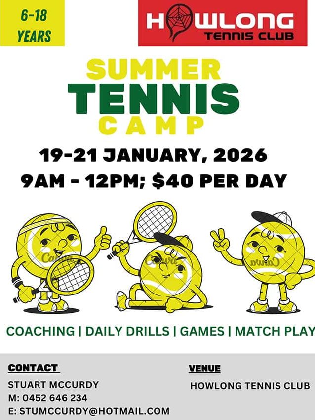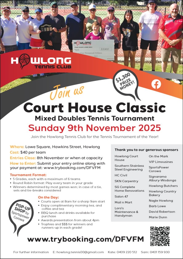 For Casual Court Hire a key is available from Mail ‘n’ Mart – 55 Hawkins Street Howlong.