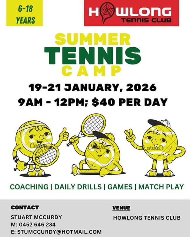 Tennis coach Stuart McCurdy is hosting a Summer Tennis Camp from 19–21 January for players aged 6–18, at the Howlong Tennis Club. The camp combines expert coaching with plenty of games and activities to help kids improve their tennis skills while having a great time. Attend for one day or sign up for the full…